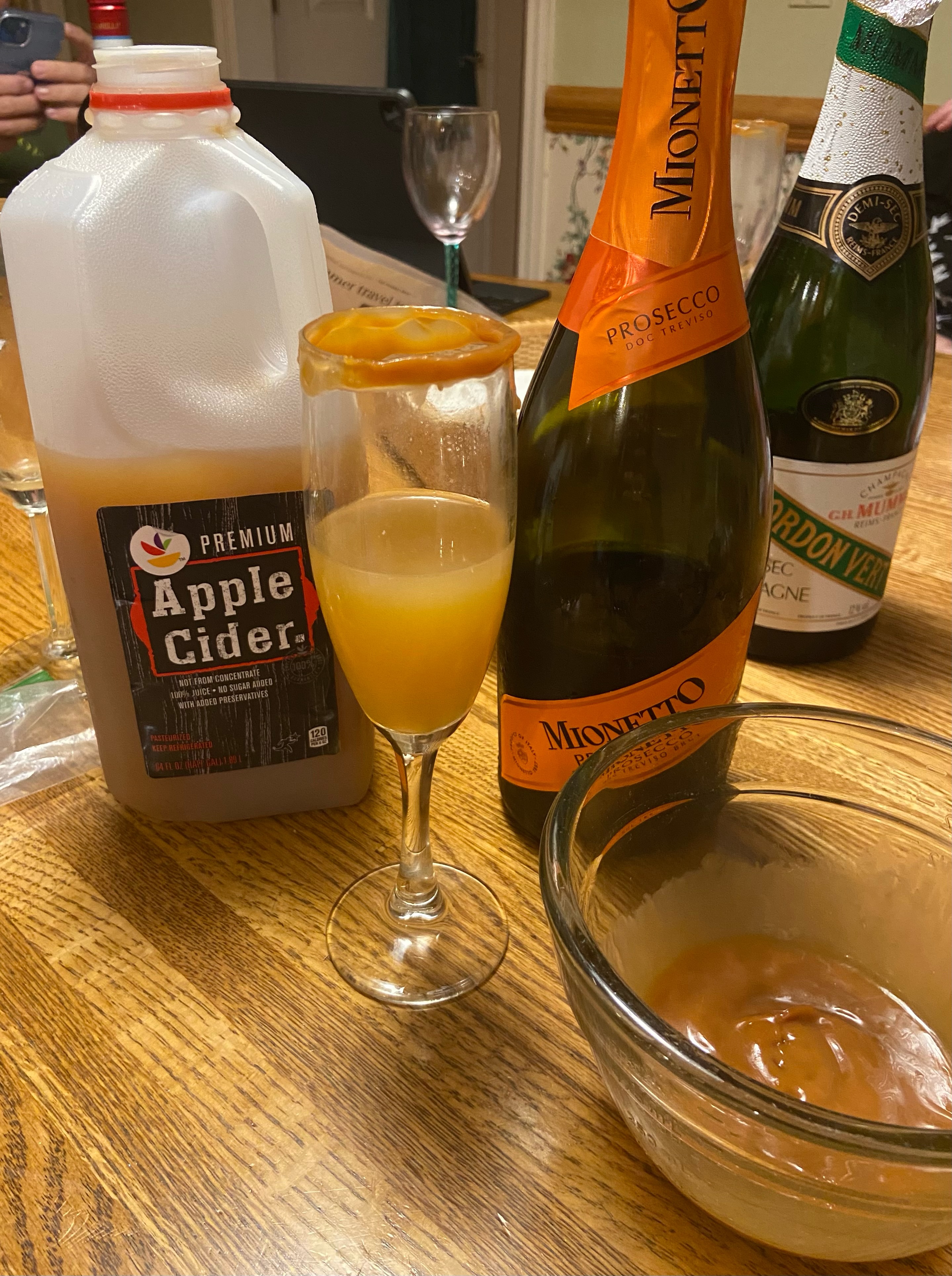 Melt the caramel on the stove (or in the microwave with a splash of water). Dip your champagne glasses in the caramel. Just add however much champagne and apple cider you want and enjoy!!