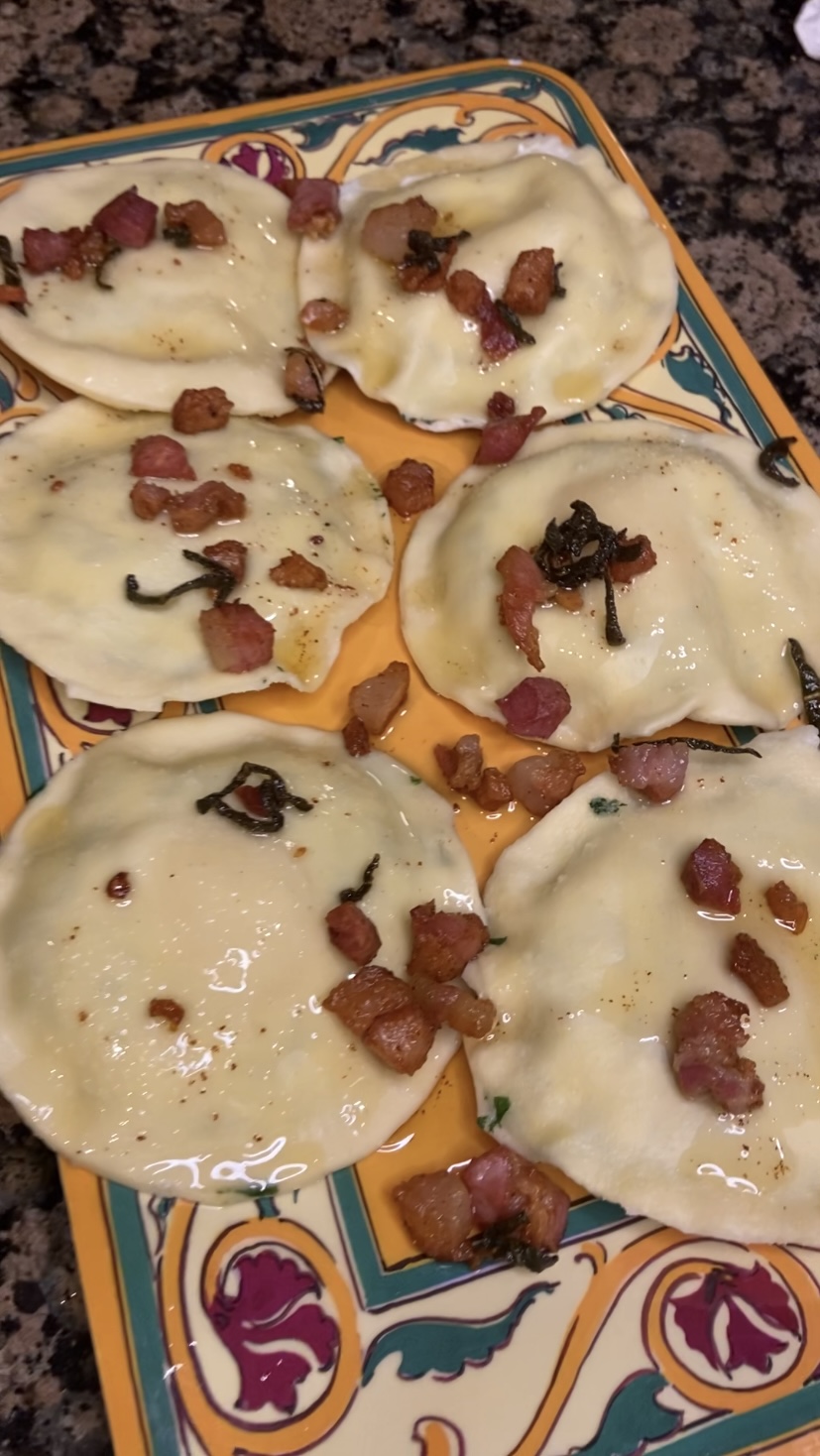 -Put the ravioli on a serving platter and drizzle the pancetta and sage butter on top and serve!