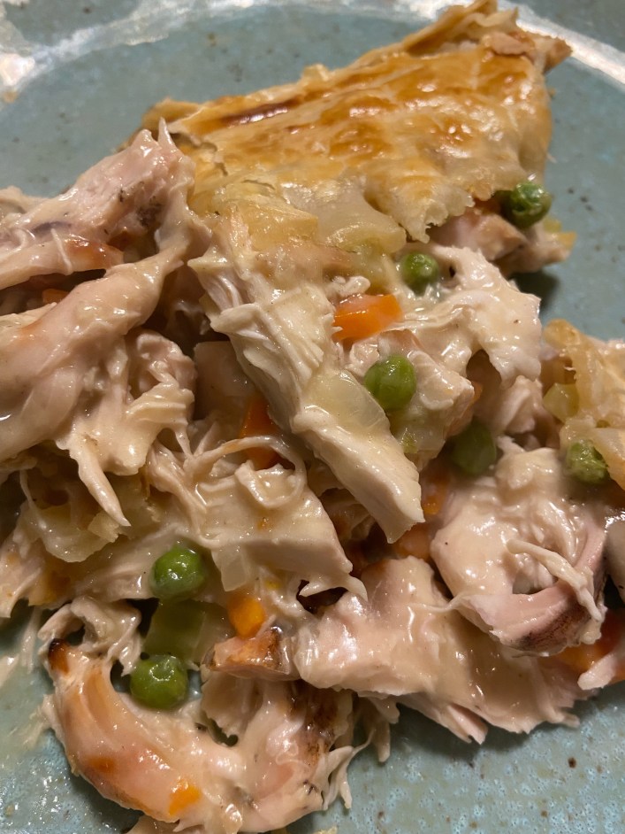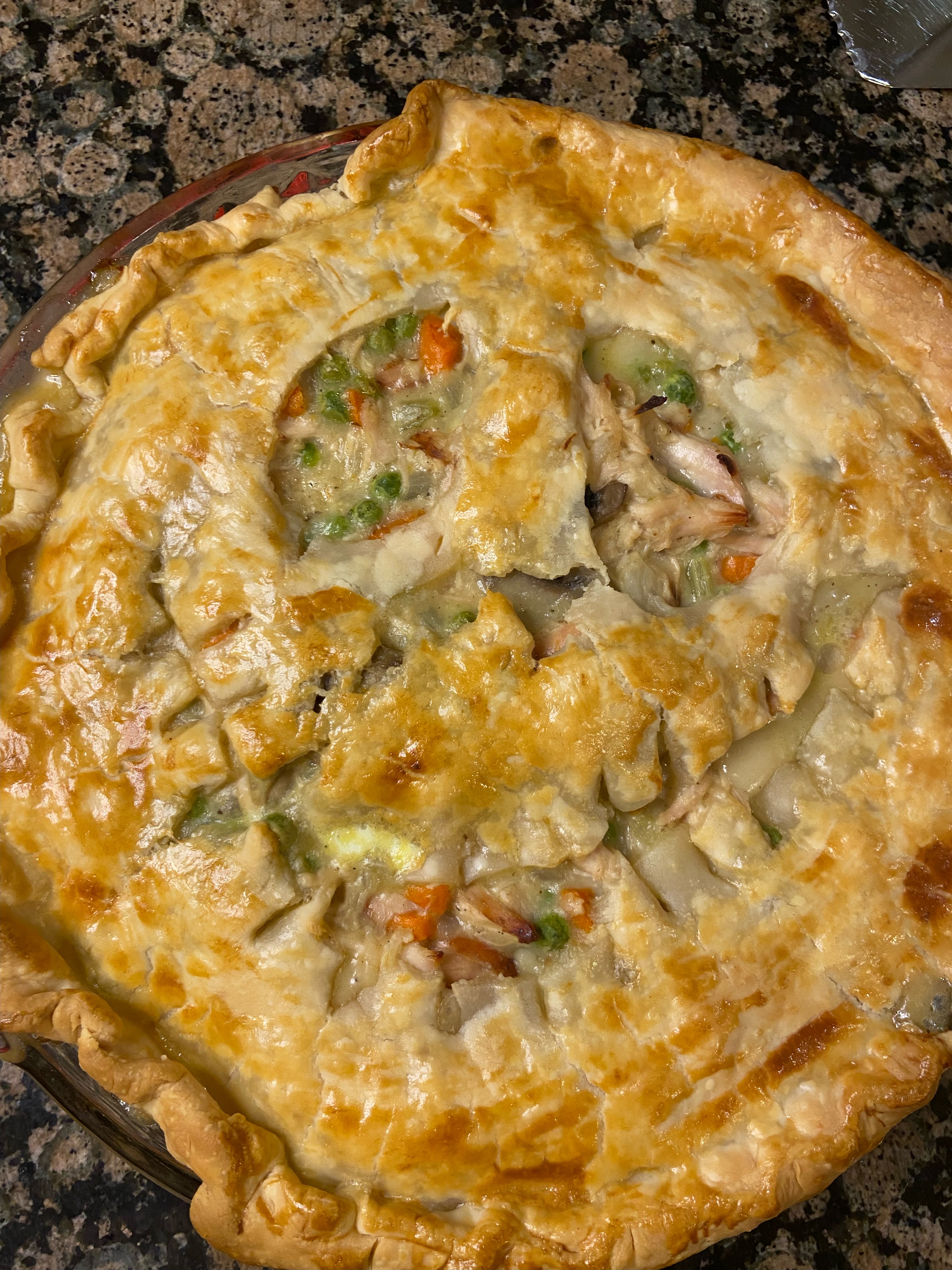 **When I make chicken pot pie I prefer to do only the top crust. If you prefer both top and bottom, place a rolled out round of dough in the pie dish before putting in the filling. Cook it for a little longer than stated above, 30-35 minutes, to cook all the way through. I used store bought dough, but if you have time by all means make it home made! I’ll be posting my pie dough recipe closer to Thanksgiving.
