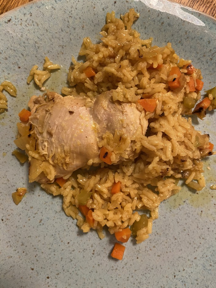 -Add in the washed rice and let it toast. Cover with the broth then nestle the chicken back in.