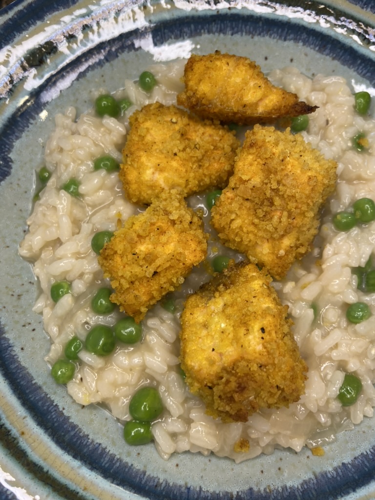 I love this recipe it’s cute and easy and I love that they have a crust without all the work of doing the whole dredge. I had mine with risotto (as per usual, this is basically becoming a risotto blog).