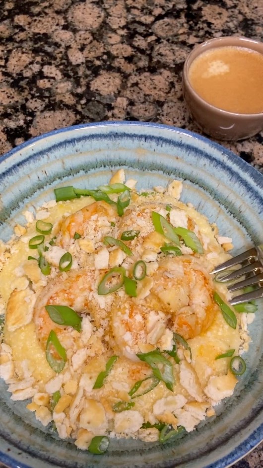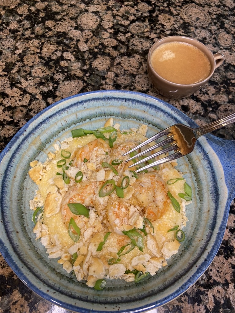 -Serve in a bowl, add the shrimp, scallions, extra tabasco, and whatever crunchy topping you could find.