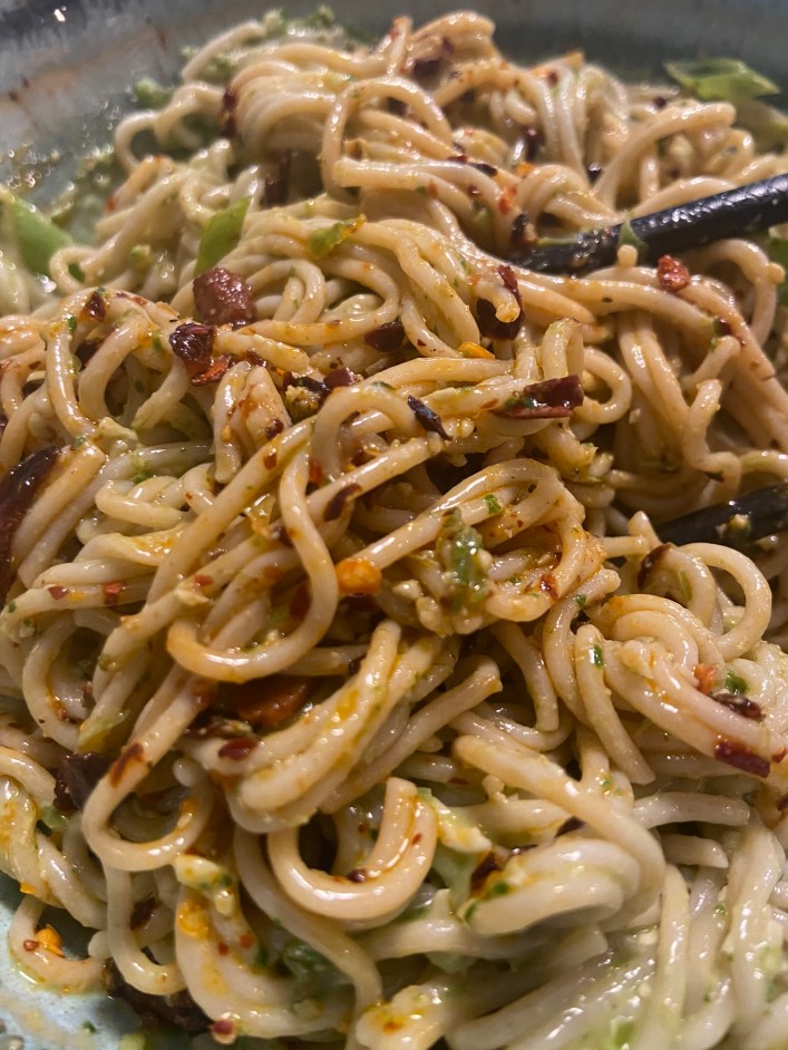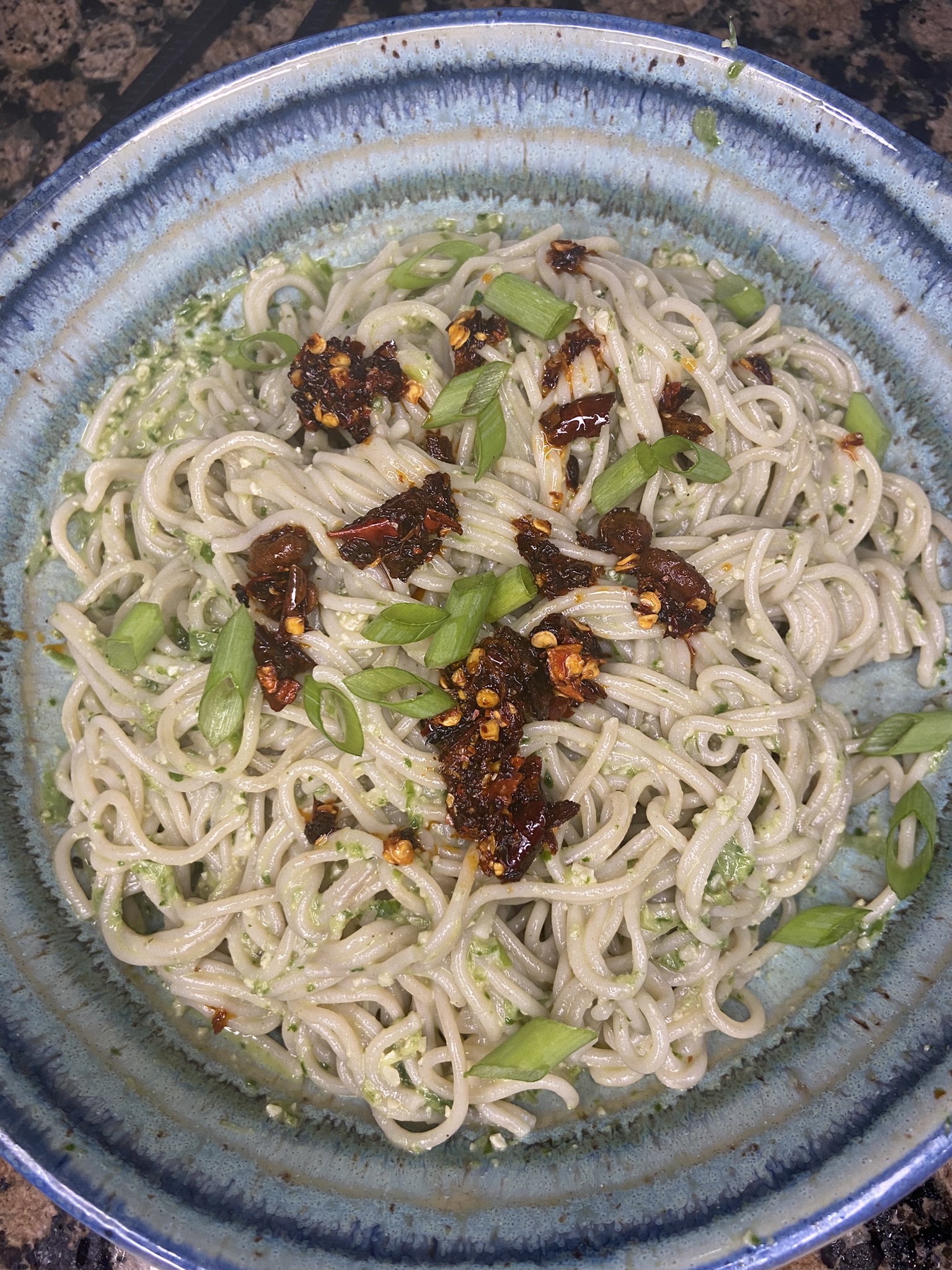 One night I was hungry thinking about food and this idea came randomly for asian pesto using scallions as the main ingredient instead of the basil. I tried to take all the classic pesto ingredients and substitute them for asian ingredient or just things that would go well with the scallions. Try it and let me know what you think!