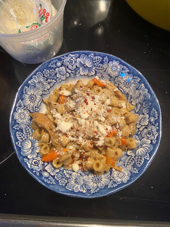 Welcome back to Pasta A-Z where I’m making pasta dishes from every letter of the alphabet. Today is D for ditalini. The first three dishes came to me easily, but I got stumped at D. I decided to go for a pasta shape instead of dish. So far all my pasta dishes have been something classic Italian, but I strayed from that here. I wanted to make chicken soup with ditalini because when I think of ditalini I think soup. This was one of those recipes that just didn’t go how I intended, but I was very pleasantly surprised- I liked it better. I added way too much ditalini to the soup and it absorbed the majority of the chicken stock (which I made… from scratch). Instead of a soup, it was just a brothy (and very delicious) pasta dish. This was sous chef Dale’s favorite pasta so far!